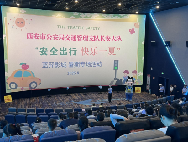 西安市公安局交通管理支队长安大队创新宣传载体,将交通安全课堂搬进影院,以“安全出行 快乐一夏”为主题开展沉浸式宣传活动。通过光影教育、趣味互动、卡通引导三维模式,为少年儿童送上生动的交通安全“暑期礼包”,让安全知识在轻松氛围中入脑入心。