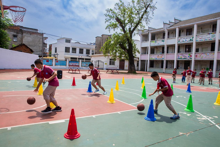 7月23日,咸宁市咸安区汀泗桥镇小学操场上,学生们进行篮球训练。新华网 钟奕 摄