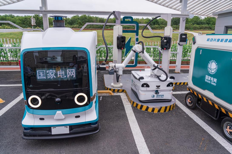 9月24日,在国家电网天津滨海供电分公司于家堡双碳创新充电站展示的自动充电机器人和自动送电机器人。新华网 钟奕 摄