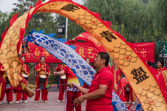 9月26日,在天津市西青区杨柳青镇白滩寺村文化广场,村民们正在舞动着融入了传统舞龙元素的“彩带龙”。新华网 钟奕 摄