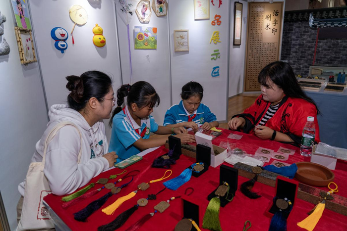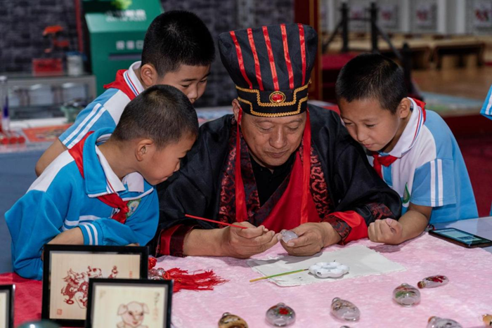 9月26日,在天津市传统文化研学基地,志愿者正在向小朋友们介绍内画鼻烟壶的传统技艺。新华网 钟奕 摄