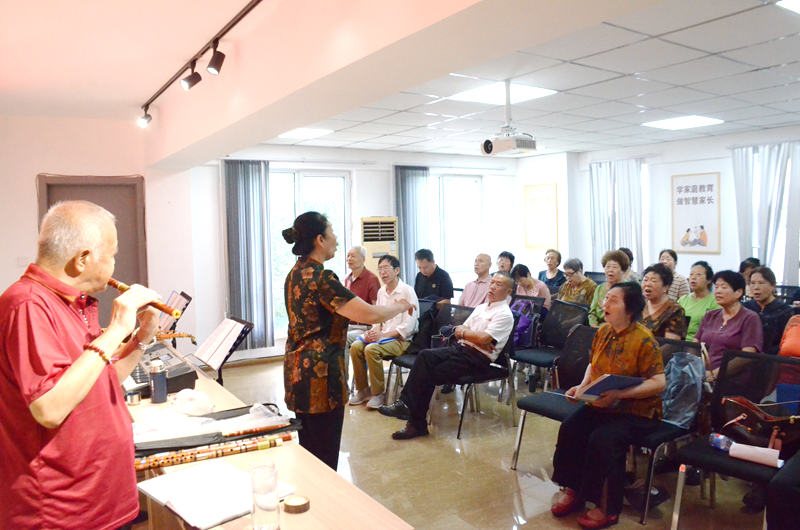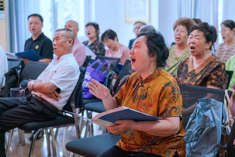 8月21日,河北省承德市双桥区丽水社区居民正在新时代文明实践站活动室内排练合唱曲目《共筑中国梦》。新华网记者 钟奕 摄