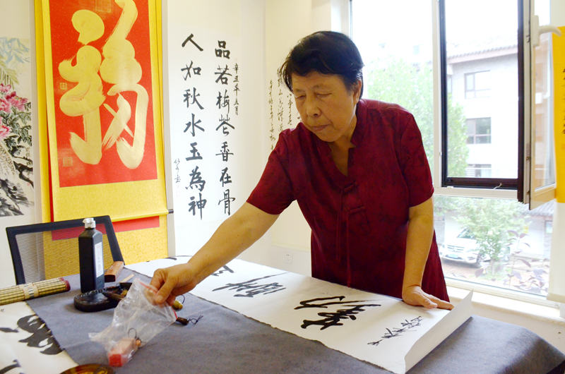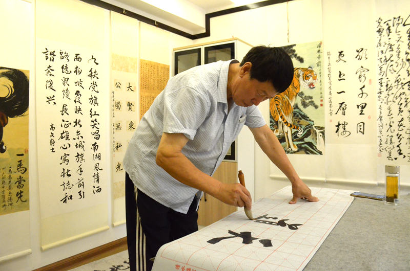 8月21日,河北省承德市双桥区丽水社区居民正在新时代文明实践站活动室创作书法作品。 新华网发(承德日报社记者 张雨樵 摄)