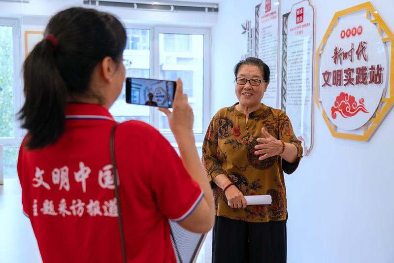 8月21日,“文明中国”主题采访报道组记者正在河北省承德市双桥区丽水社区新时代文明实践站采访参加文化活动的居民。 新华网记者 钟奕 摄