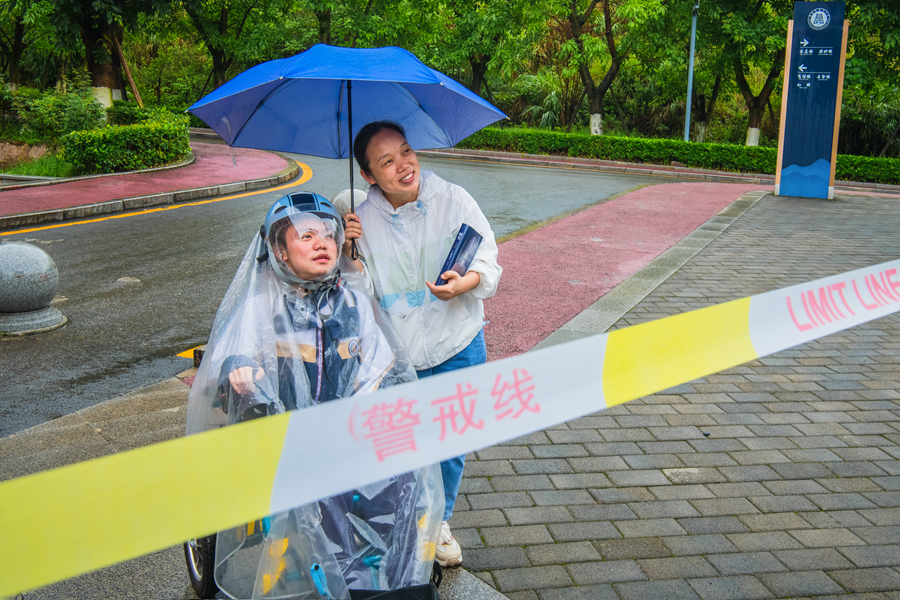 周朝喜和儿子罗睿燊在高考考场外候考(资料图)。(中共重庆市綦江区委宣传部供图)