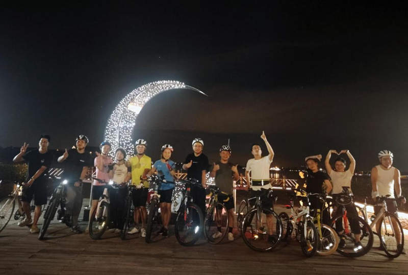“青骑行”骑行爱好者参加湘家荡环湖夜骑。新华网发(浙江省嘉兴市南湖区七星街道湘南社区 傅玉莲 摄)