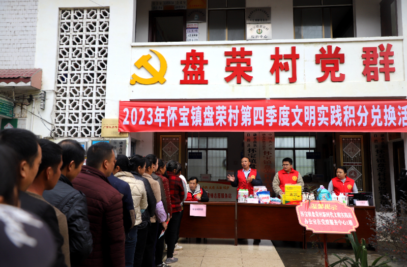 盘荣村积极推行文明实践积分制,将文明实践积分作为文明家庭、星级文明户、道德模范、孝贤之家等评优评先的重要依据,结合村规民约制定《盘荣村文明实践积分兑换标准》,设立文明实践积分兑换点。通过存积分、亮积分、兑积分,鼓励村民自觉参与志愿服务活动,自觉遵守村规民约,自觉将“村里事”变为“家里事”,让比积分、比文明的良性“攀比”在盘荣村蔚然成风。