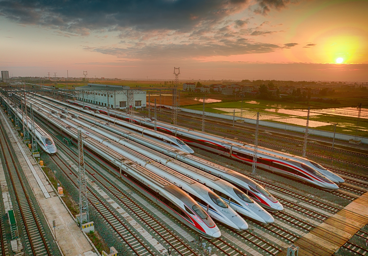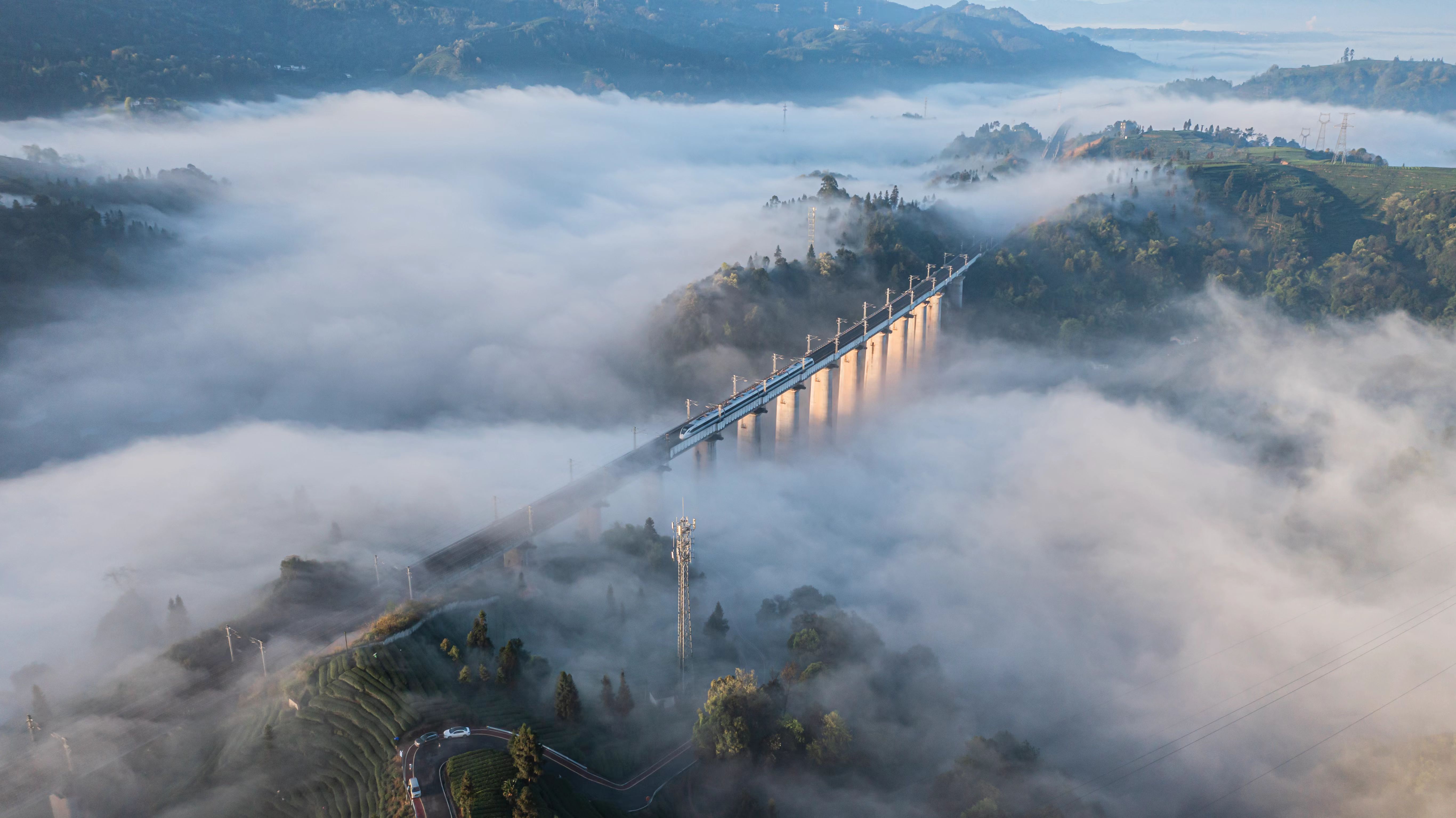 晨雾轻绕,高铁穿行在茶田之间,满载梦想,奔向远方。