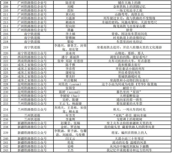 打印:12月30日,由中宣部文明创建局、中央网信办网络传播局、中国作协创联部、中国国家铁路集团有限公司党组宣传部联合举办的“我的铁路风景”故事汇原创美文征集展示活动优秀作品名单公布,共252件。