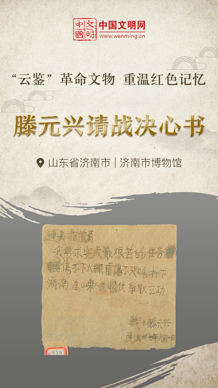 革命文物,承载党和人民英勇奋斗的光荣历史,是弘扬革命传统和革命文化、加强社会主义精神文明建设、激发爱国热情、振奋民族精神的生动教材。中国文明网“文明之声·云鉴馆藏”专栏邀您走进各地革命博物馆、纪念馆、党史馆等红色主题展馆,一起“打卡”红色地标,“云鉴”红色馆藏,汲取奋进力量。今天为您介绍济南市博物馆的馆藏文物——滕元兴请战决心书。
